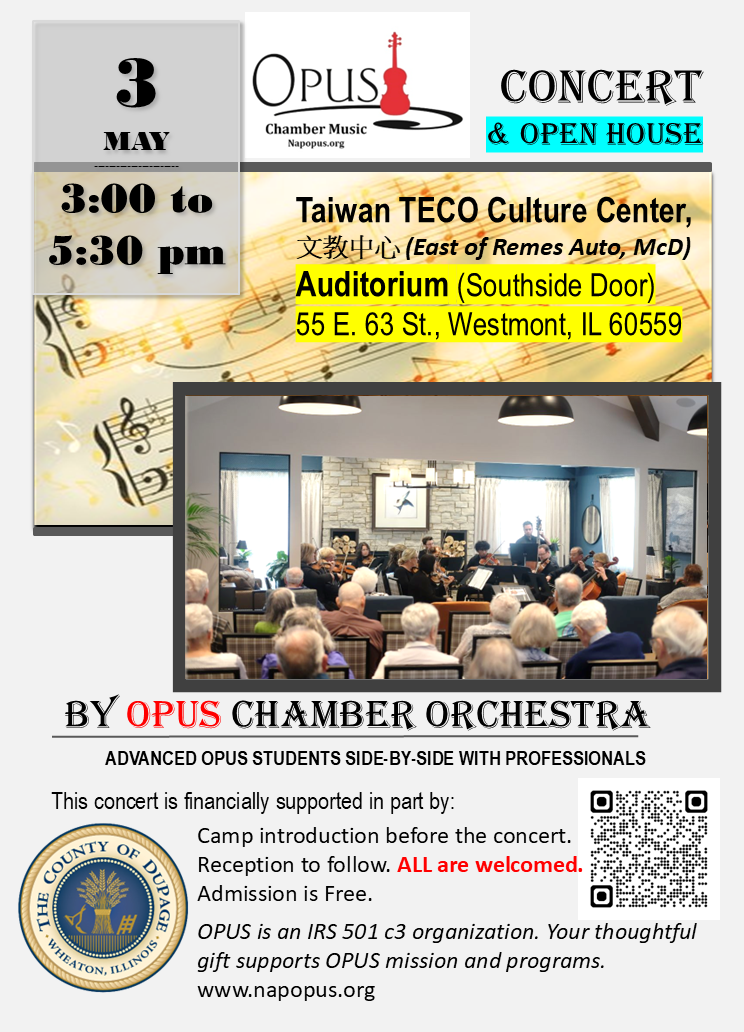 - OPUS OPEN HOUSE and OPUS Chamber Orchestra Concert (professionals and advanced students) – 3:00 to 5:30 pm on Sunday May 3rd, at TECO Culture Center, Westmont. Admission is free. Bring a friend! More info here.
